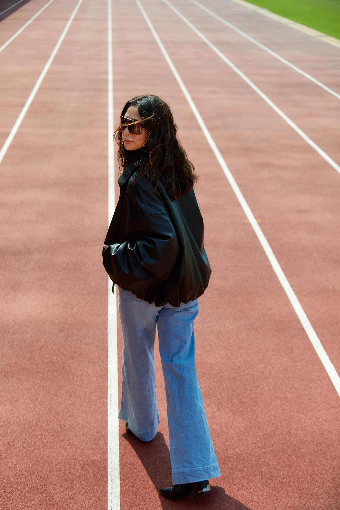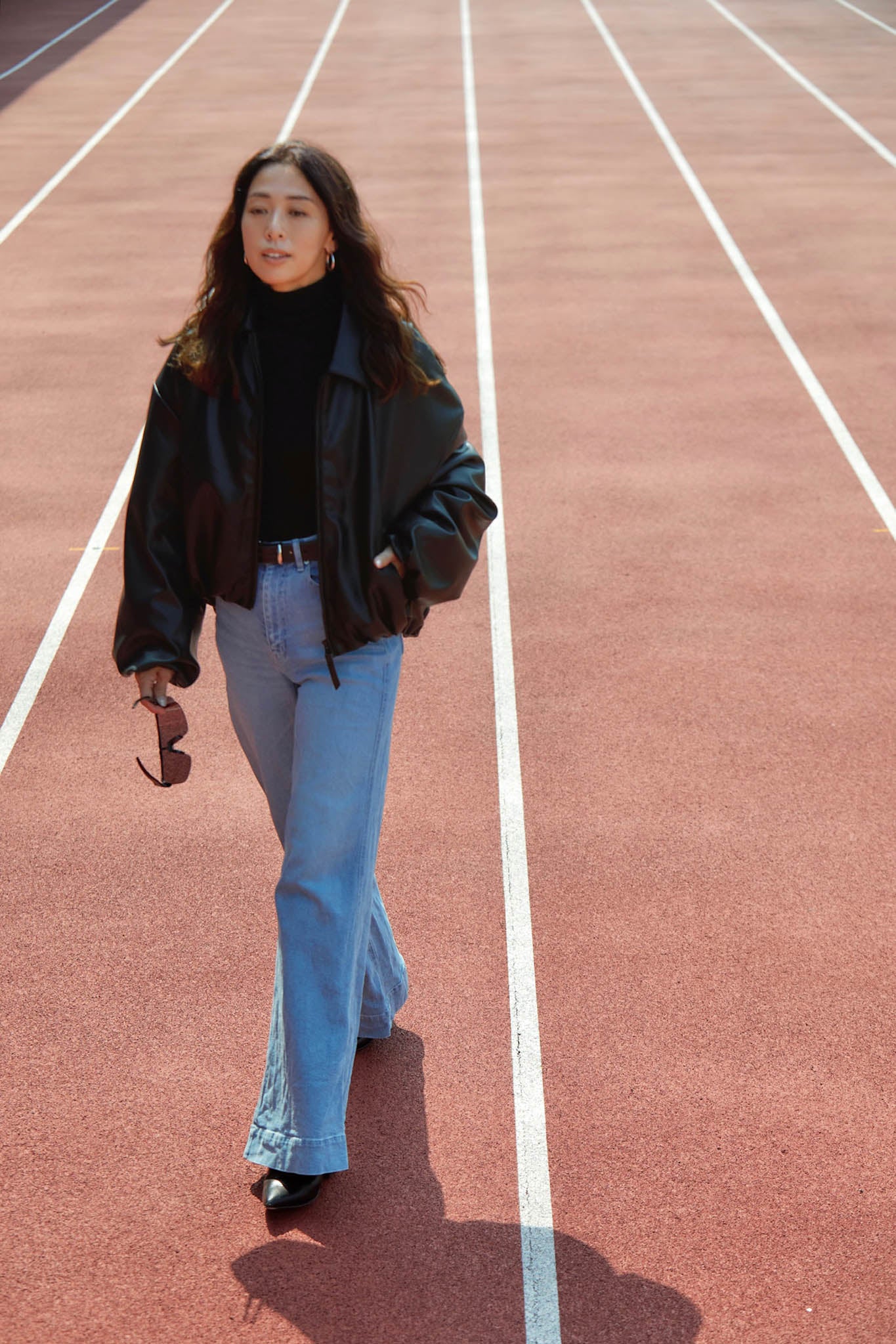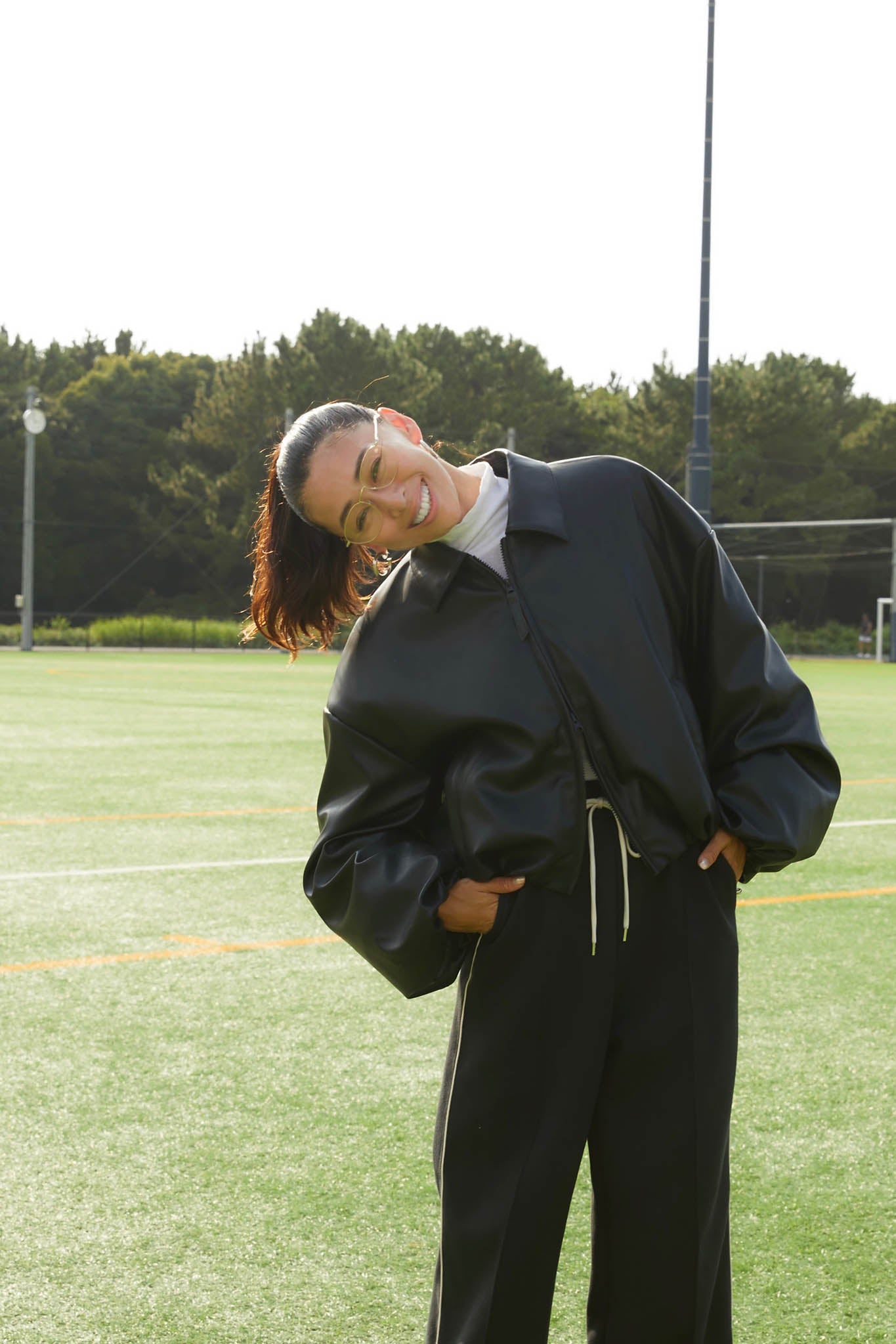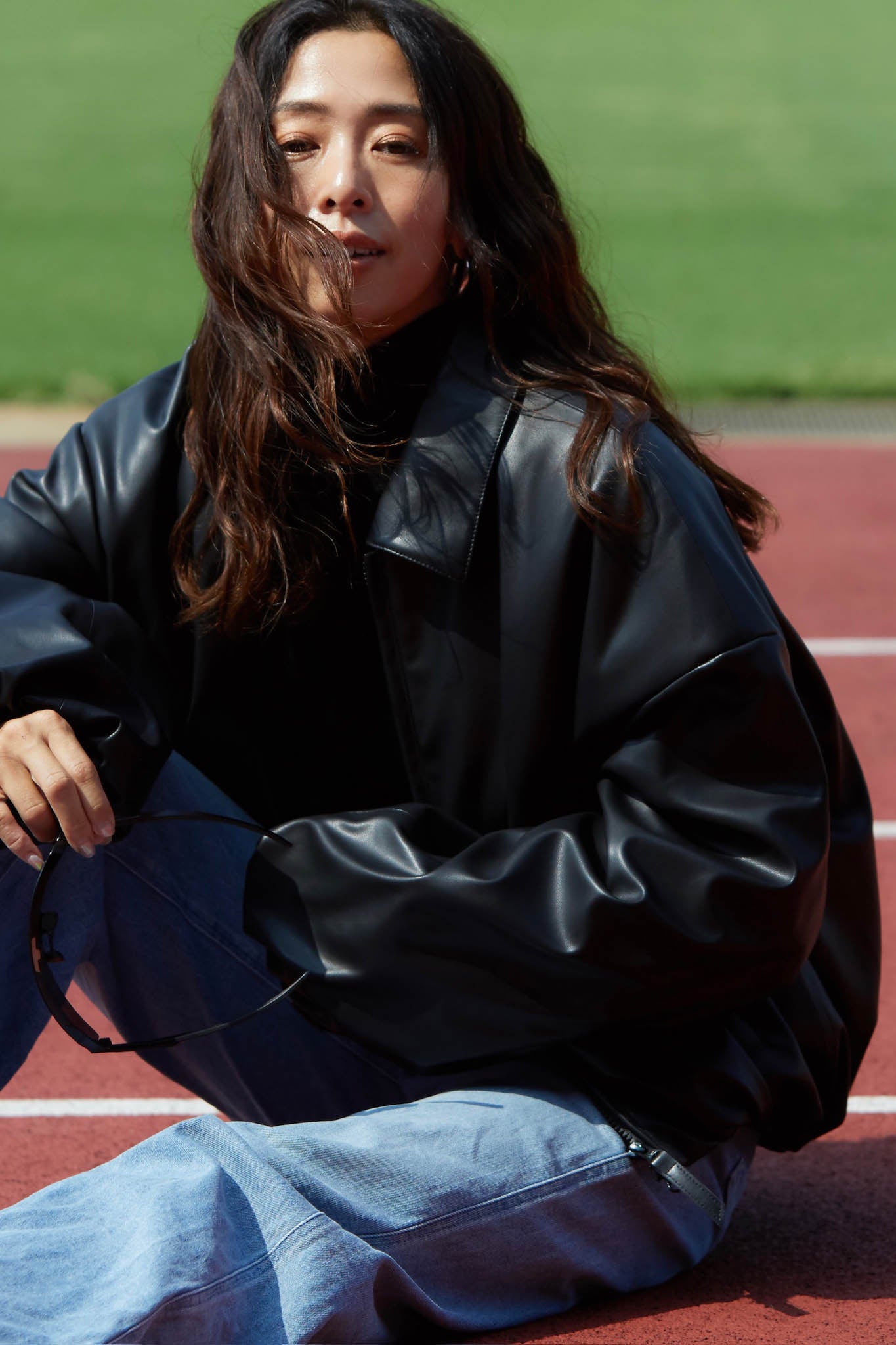 柔らかな質感のヴィーガンレザーを使用し、高級感のある上品な艶としなやかさを両立。裾裏に配したゴムが自然なブラウジングを生み、女性らしい丸みのあるシルエットを演出します。前身はショート丈でボトムとバランスがとりやすく、ダブルジップ仕様で腰位置を自在に調整可能。後ろはヒップにかかる絶妙な丈で安心感も◎。ゆったりとしたスリーブは中に大きなセーターやスウェットも着れる今時の万能さ。滑りの良いライナー(裏地)付きで、ニットの上からも摩擦がなくノンストレスな着心地です。