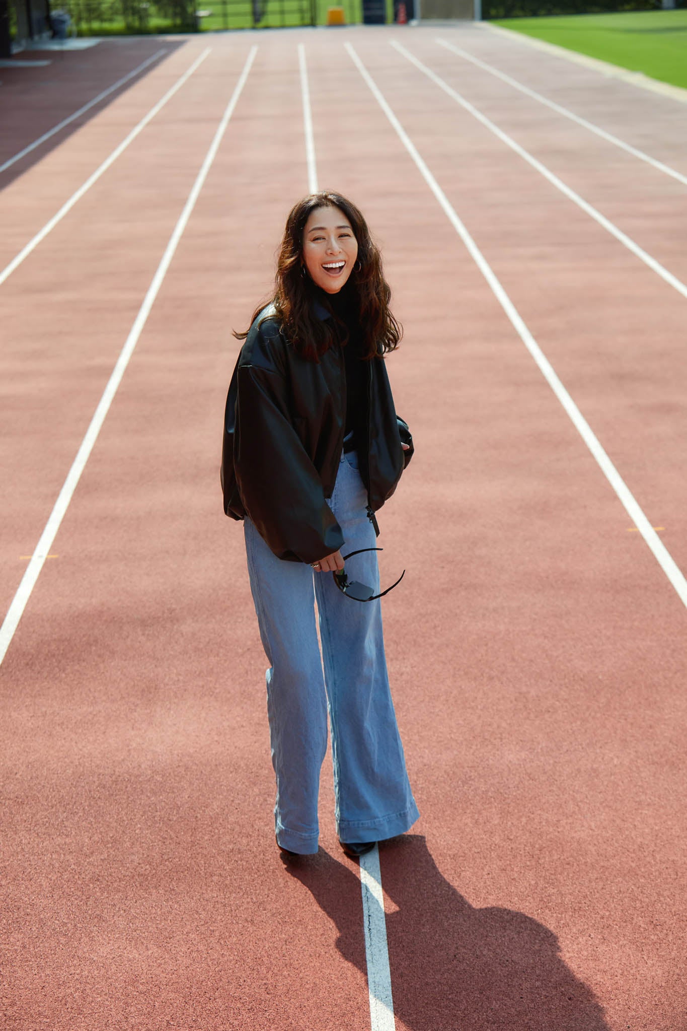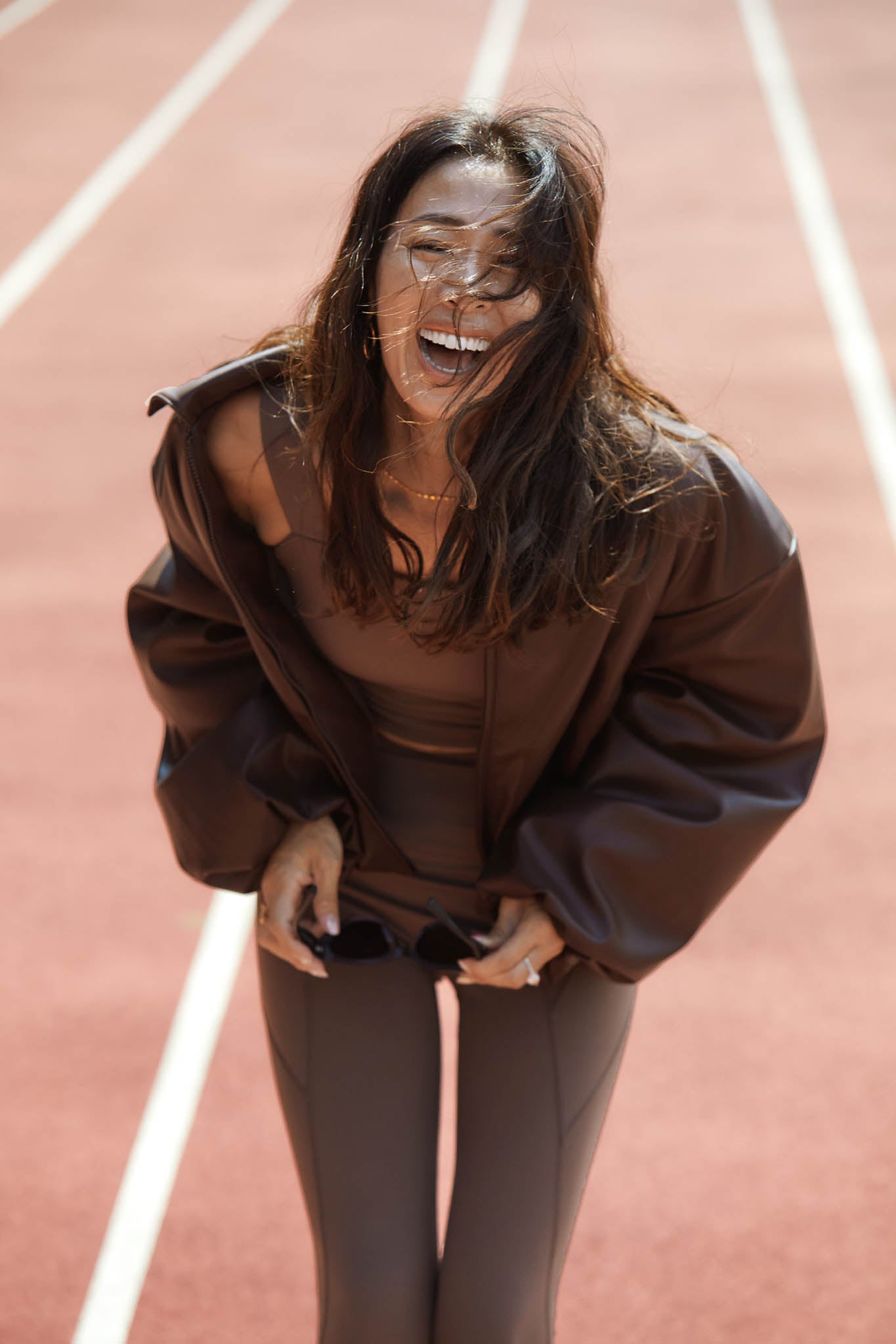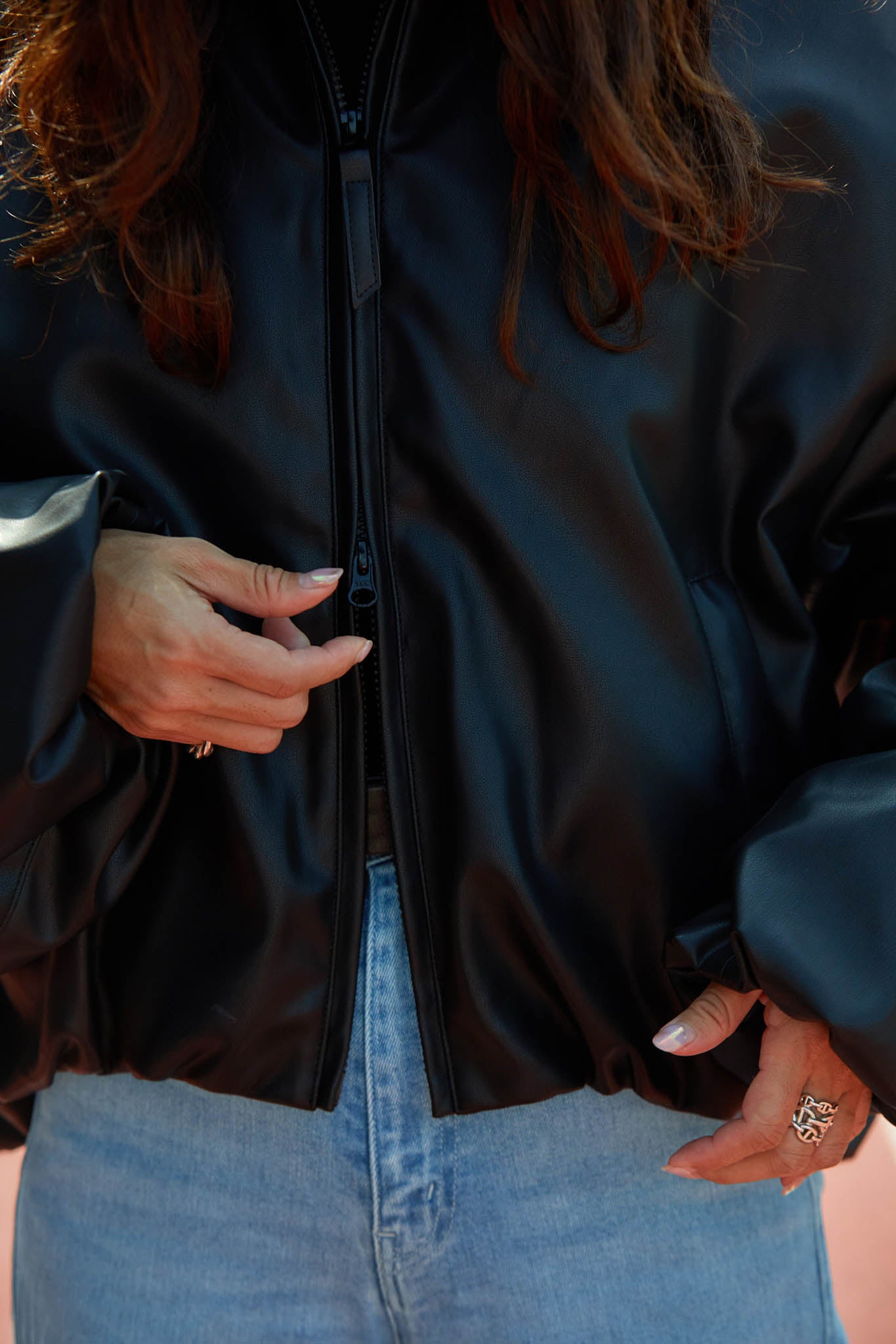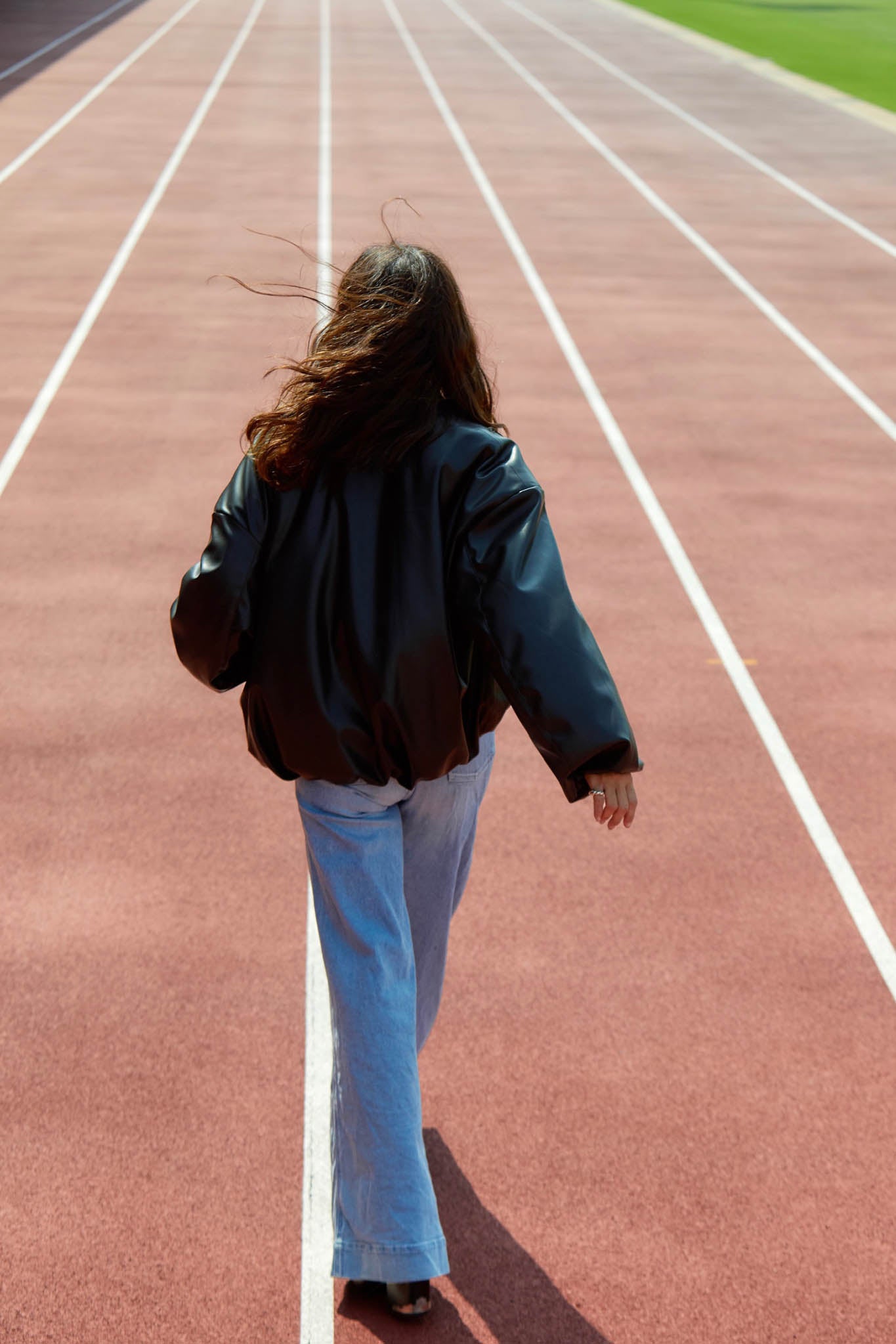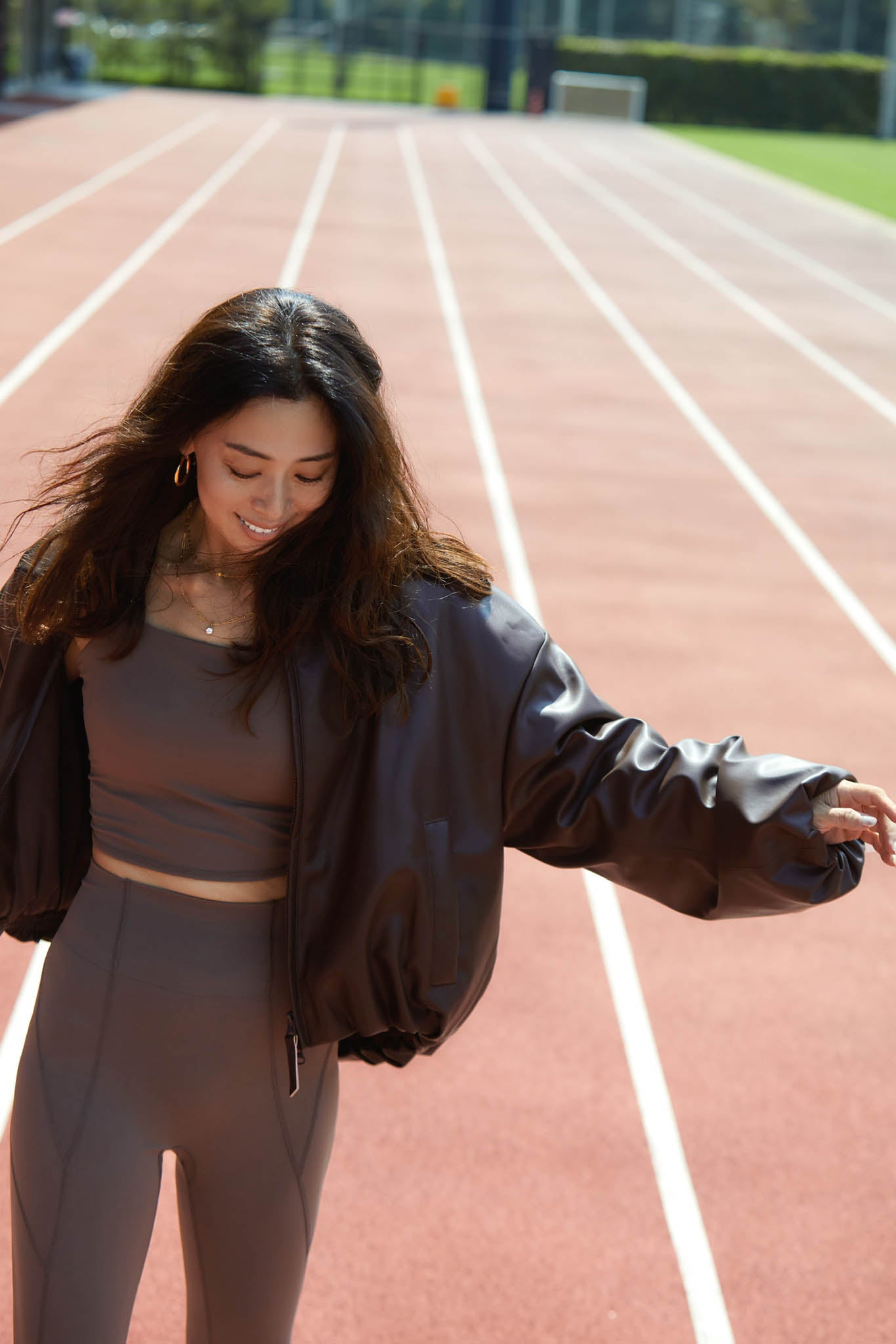 柔らかな質感のヴィーガンレザーを使用し、高級感のある上品な艶としなやかさを両立。裾裏に配したゴムが自然なブラウジングを生み、女性らしい丸みのあるシルエットを演出します。前身はショート丈でボトムとバランスがとりやすく、ダブルジップ仕様で腰位置を自在に調整可能。後ろはヒップにかかる絶妙な丈で安心感も◎。ゆったりとしたスリーブは中に大きなセーターやスウェットも着れる今時の万能さ。滑りの良いライナー(裏地)付きで、ニットの上からも摩擦がなくノンストレスな着心地です。
